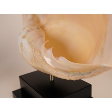 The Syrinx aruanus, commonly known as the Australian Trumpet, is a remarkable gastropod shell celebrated for its grandeur and natural beauty. This stunning specimen is mounted in a handmade brass base. The shell’s surface features smooth, spiraling ridges and fine grooves, evidence of the animal's growth over time. These natural markings create a rhythmic pattern that adds depth and texture to its appearance.