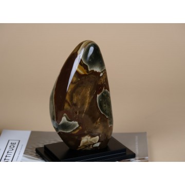 Polished Jasper Polychrome with beautiful color shades, from Madagascar, mounted in a dark brass base.
