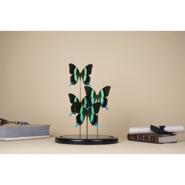 Brass glass dome with two Papilio ulysses from Ceram - Moluccan Island, a superb exclusive species with bright contrast of black and deep blue.