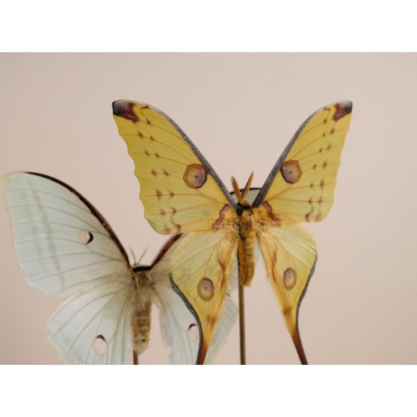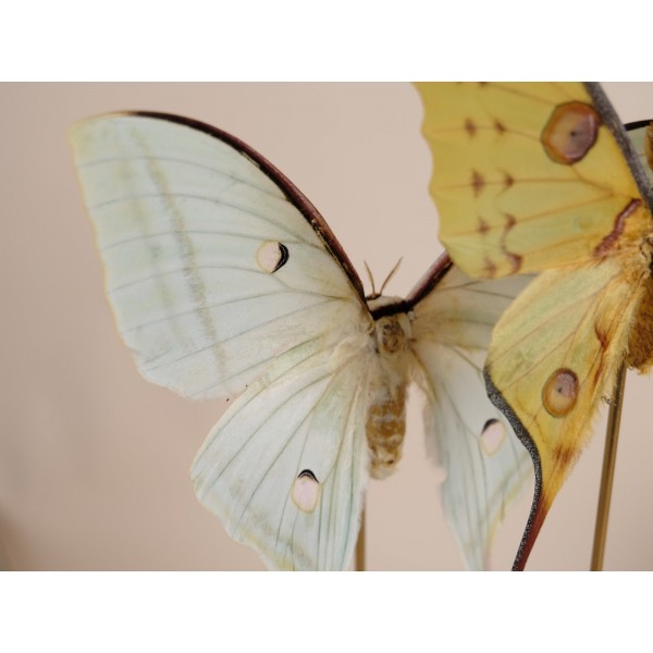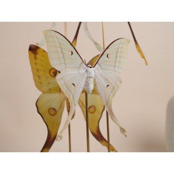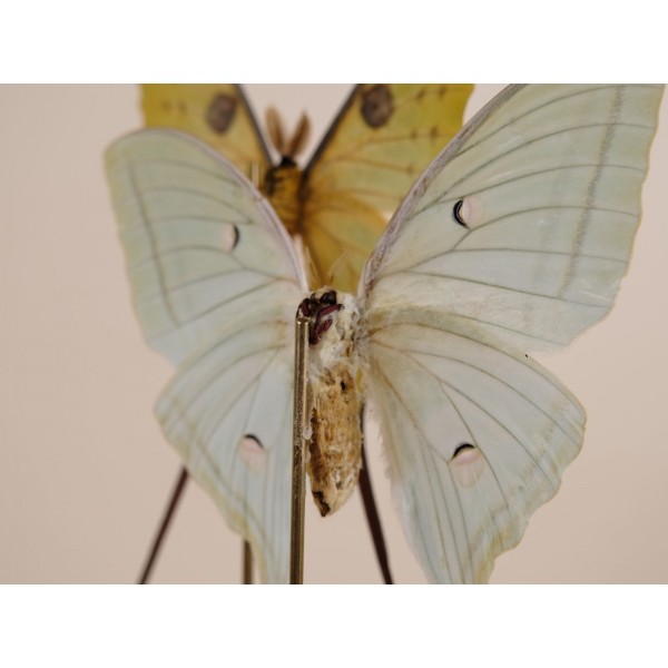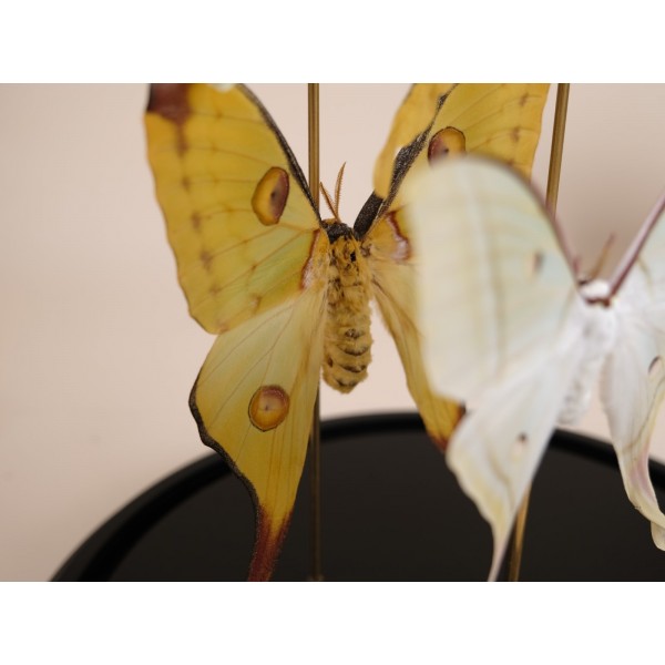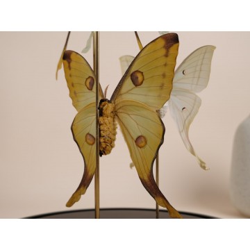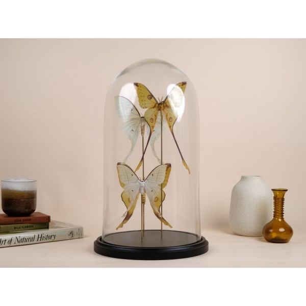 Distributed throughout South and Central America and extending north into southern Texas and peninsular Florida—with seasonal migrations into other U.S. states—this particular specimen originates from Cuba. It is beautifully mounted on a handmade branch of Namibian redwood and presented under a glass dome, creating a refined and captivating display piece.