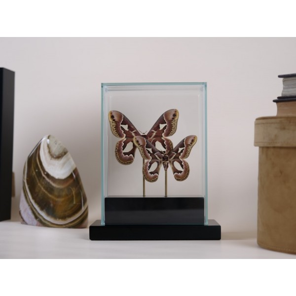 Mounted in a black glass frame.