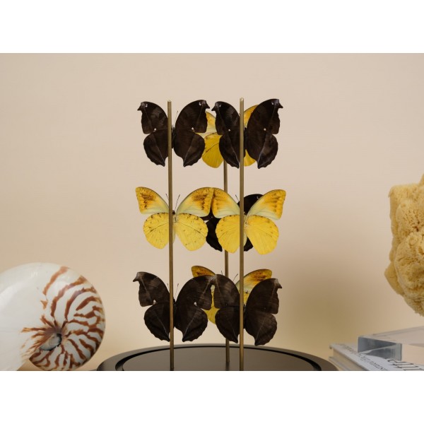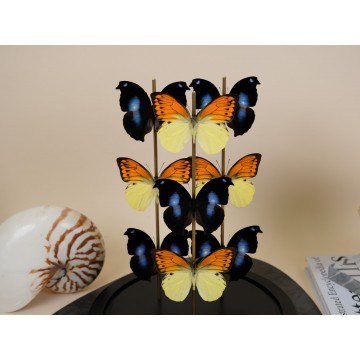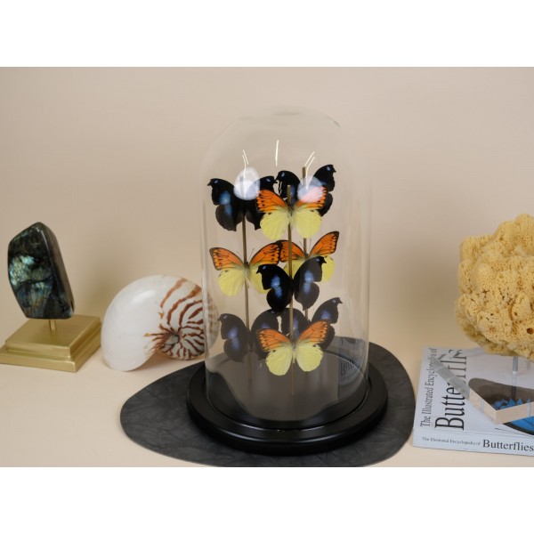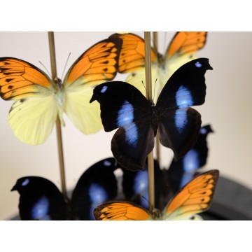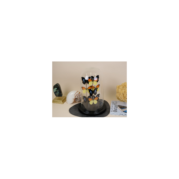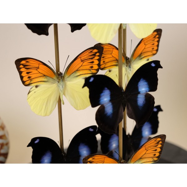 Witness the magnificence of a superb big glass dome housing two exquisite butterflies from each of the following species: Hebomoia leucippe from Ceram – Indonesia, Taenaris catops from Papua New Guinea, Cethosia hypsea from Luzon – Philippines, Palla ussheri, and Danaus chrysippus from Congo. This incredible composition showcases a vibrant display of colors and showcases stunning specimens.