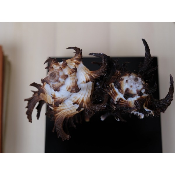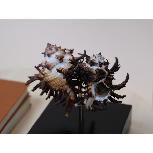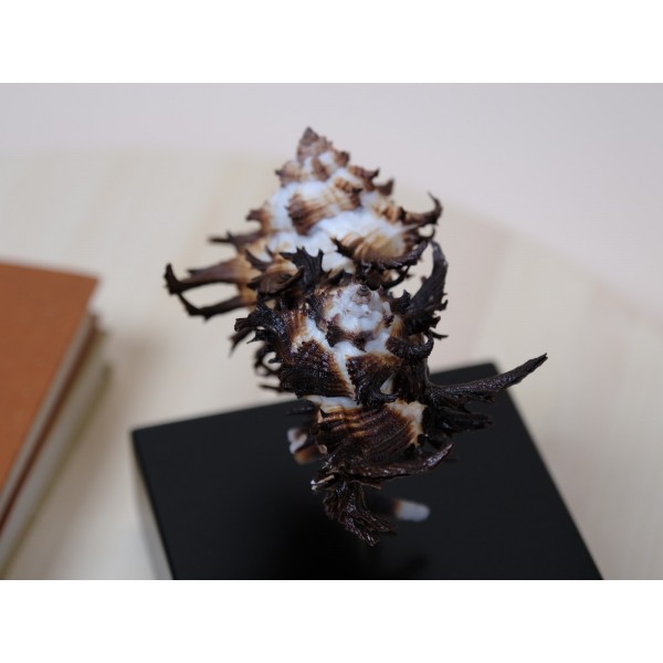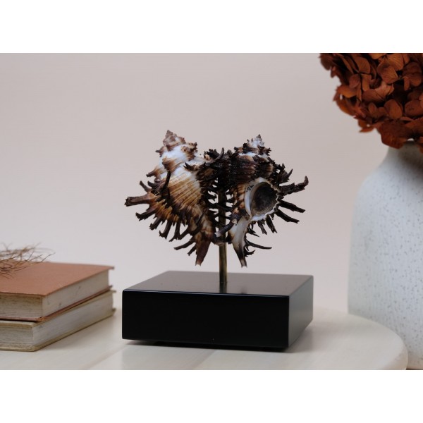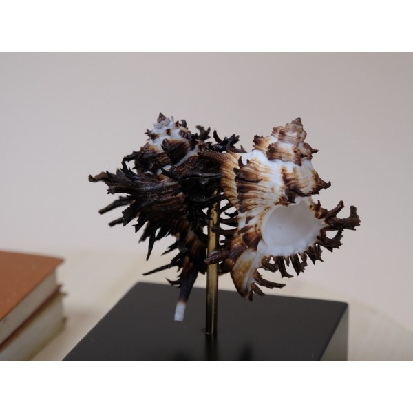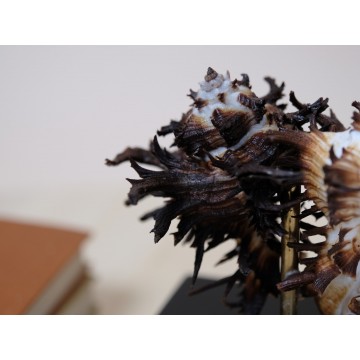 A stunning medium-sized marine life glass dome featuring a meticulously curated selection of ocean treasures. At the heart of the piece is a Seriatopora hystrix coral from the Solomon Islands, surrounded by a fascinating array of seashells and marine specimens: an Argonauta hians (paper nautilus), Mitra mitra (bishop’s miter), Pecten pallium (scallop), Terebra dimidiata (auger shell), 2 Nerita textilis, and 2 Clanculus puniceus from the Philippines, as well as a Tachiacteria mirabilis, the remarkable Japanese wonder shell, from Japan. The dome is completed with vibrant orange and green sea urchins from Madagascar.