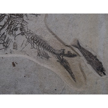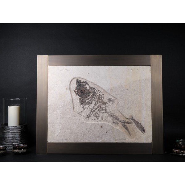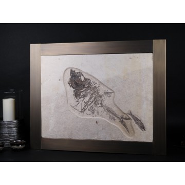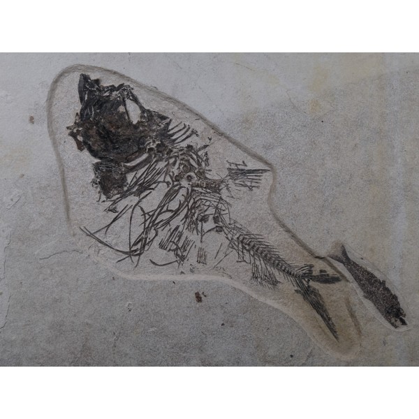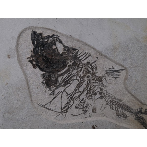An ancestor of the herring family, a very finely boned fish which is extremely difficult to prepare from the Lagerstätte varve layer of the Eocene limestones of the Green River formation 18-inch layer.